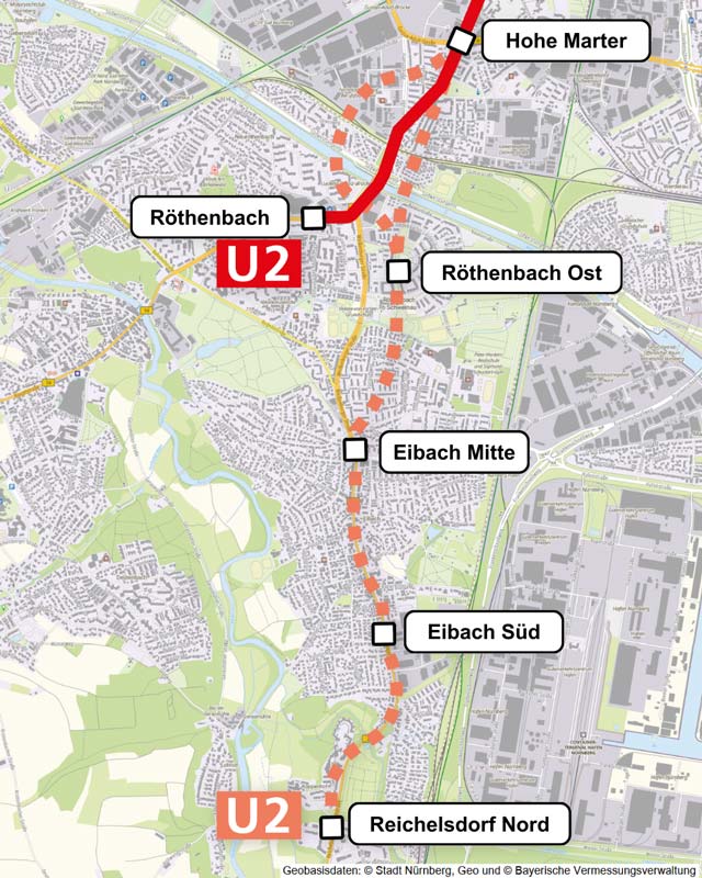 Bereits zwischen 2013 und 2015 wurde die Förderfähigkeit einer Verlängerung der U2 nach Eibach Mitte und Reichelsdorf untersucht. Damals zeigte sich, dass eine wirtschaftliche Umsetzung unrealistisch war, weshalb das Projekt zunächst nicht weiterverfolgt wurde. Nach einer Fortschreibung des Bewertungsverfahrens und erneuten Untersuchungen im Jahr 2022 haben sich aber deutlich verbesserte Rahmenbedingungen ergeben – die nun durch eine vertiefte Analyse bestätigt werden. Die konkrete Finanzierung des Projekts ist derzeit noch zu klären. Erste Abstimmungen mit den Fördermittelgebern haben bereits stattgefunden.